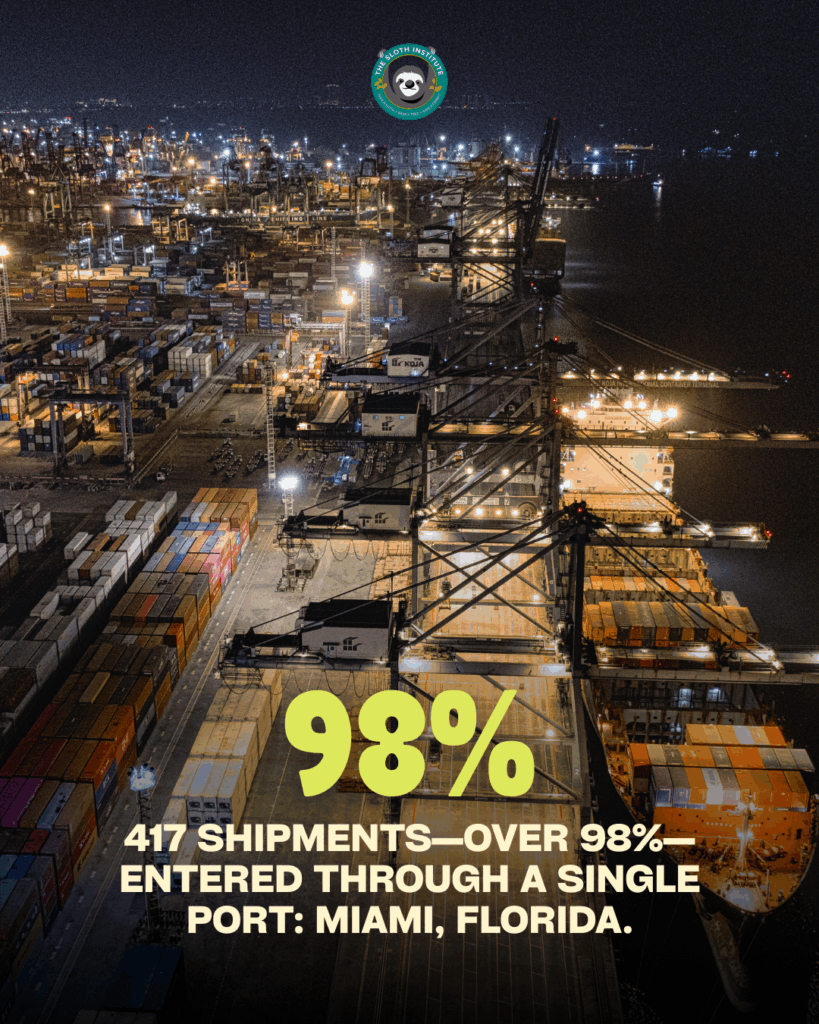- 417 shipments—over 98%—entered through a single port: Miami, Florida.