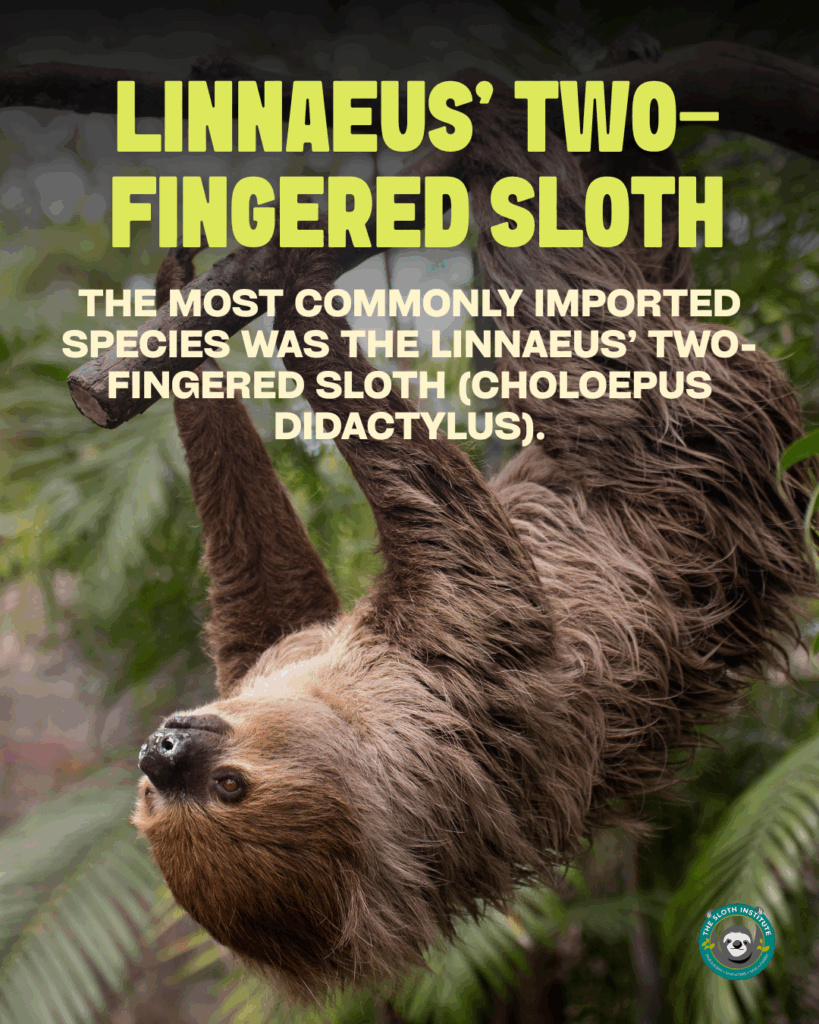 - The most commonly imported species was the Linnaeus’ two-fingered sloth (Choloepus didactylus).