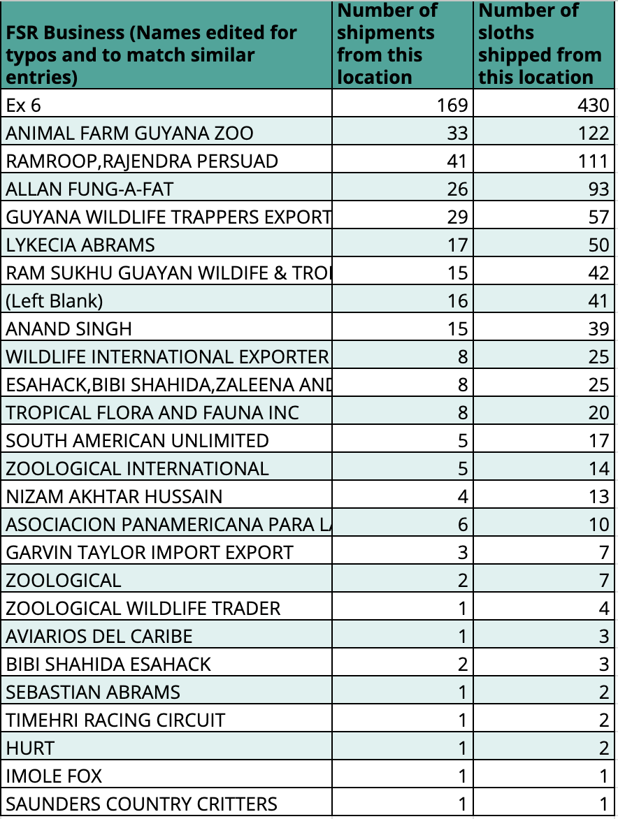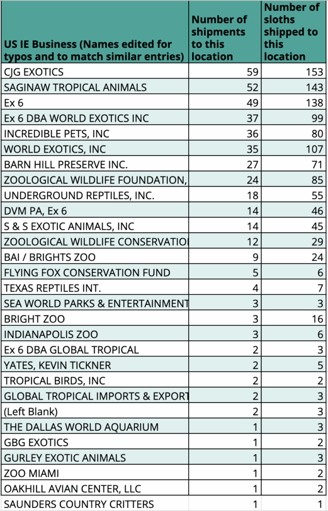 *The above list does not include the resale of sloths within the US – for example, businesses that import large numbers of sloths are supplying other facilities and private owners for a profit. This trade is not necessarily monitored by the US government*