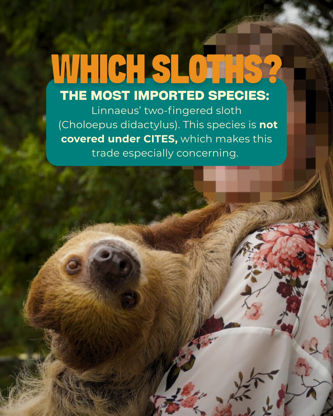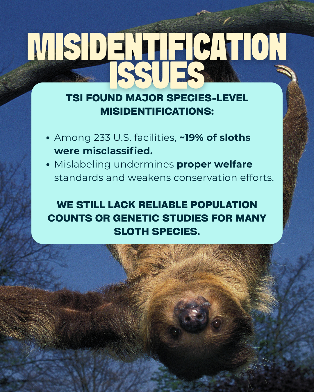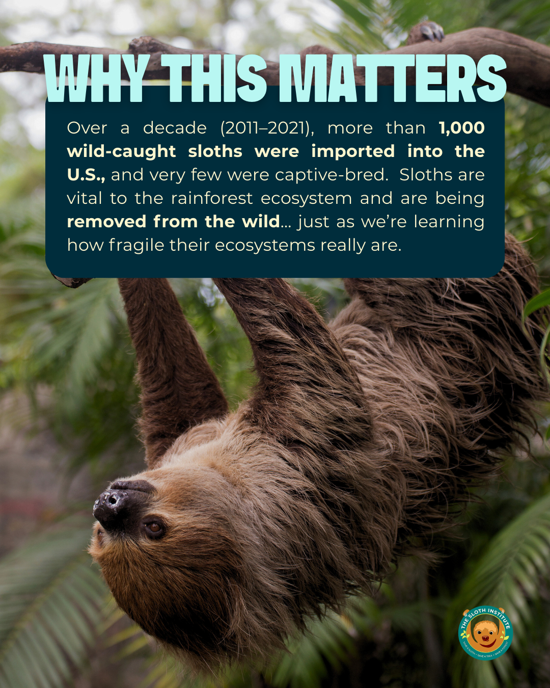 “When removed from the forest canopy and shipped internationally to the US, sloths often suffer from serious health issues related to the change in suitable diet and exposure to an artificial environment. For a lot of captured sloths, this leads to their death,” said Sam Trull, Co-Founder and Executive Director of TSI.