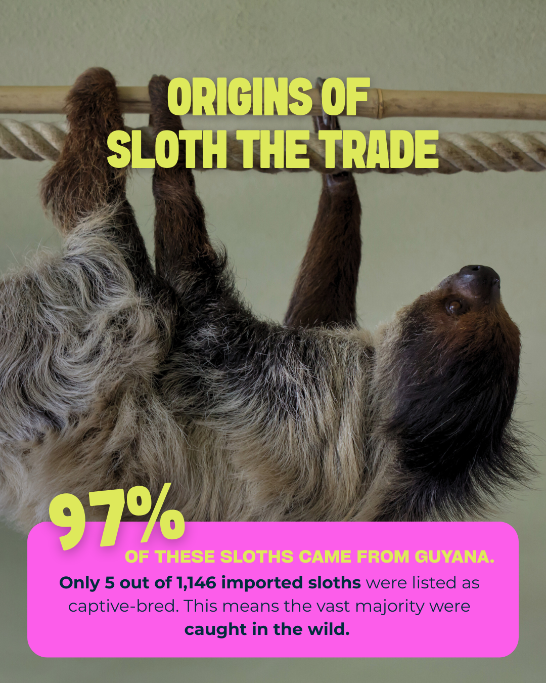 Analysis by The Sloth Institute of U.S. wildlife import data shows that between 2011 and 2021, 1,141 of 1,146 sloths imported into the United States were taken from the wild, with 97% originating from Guyana and most entering through Miami. The most frequently imported species was the two-fingered sloth (Choloepus didactylus). These figures helped motivate the new CITES measures, which aim to increase oversight and reduce pressure on wild populations. Sloth World’s animals appear to have been exported before these strengthened protections took effect. Pale-throated sloths (Bradypus tridactylus) are not yet covered by the specific measures adopted in 2025.
