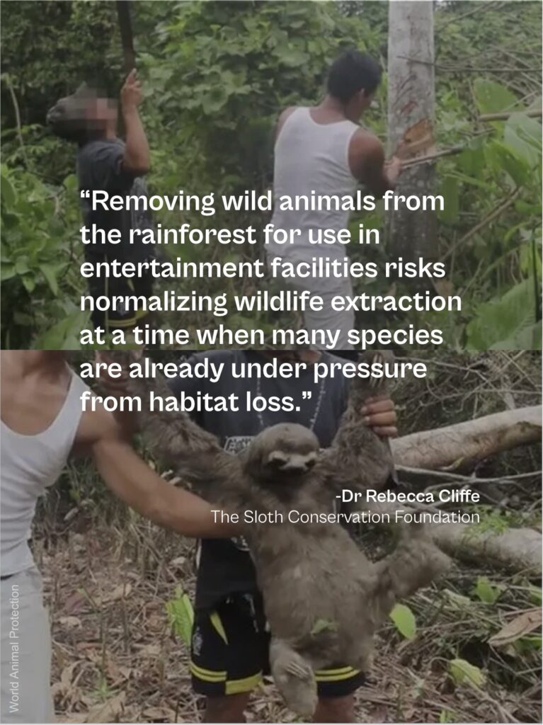 Sloths are wild mammals with complex ecological needs and no history of domestication. Extracting sloths from the wild for entertainment facilities can contribute to demand for capture and export, particularly in source countries with limited monitoring capacity, and provides no direct conservation benefit to wild populations.