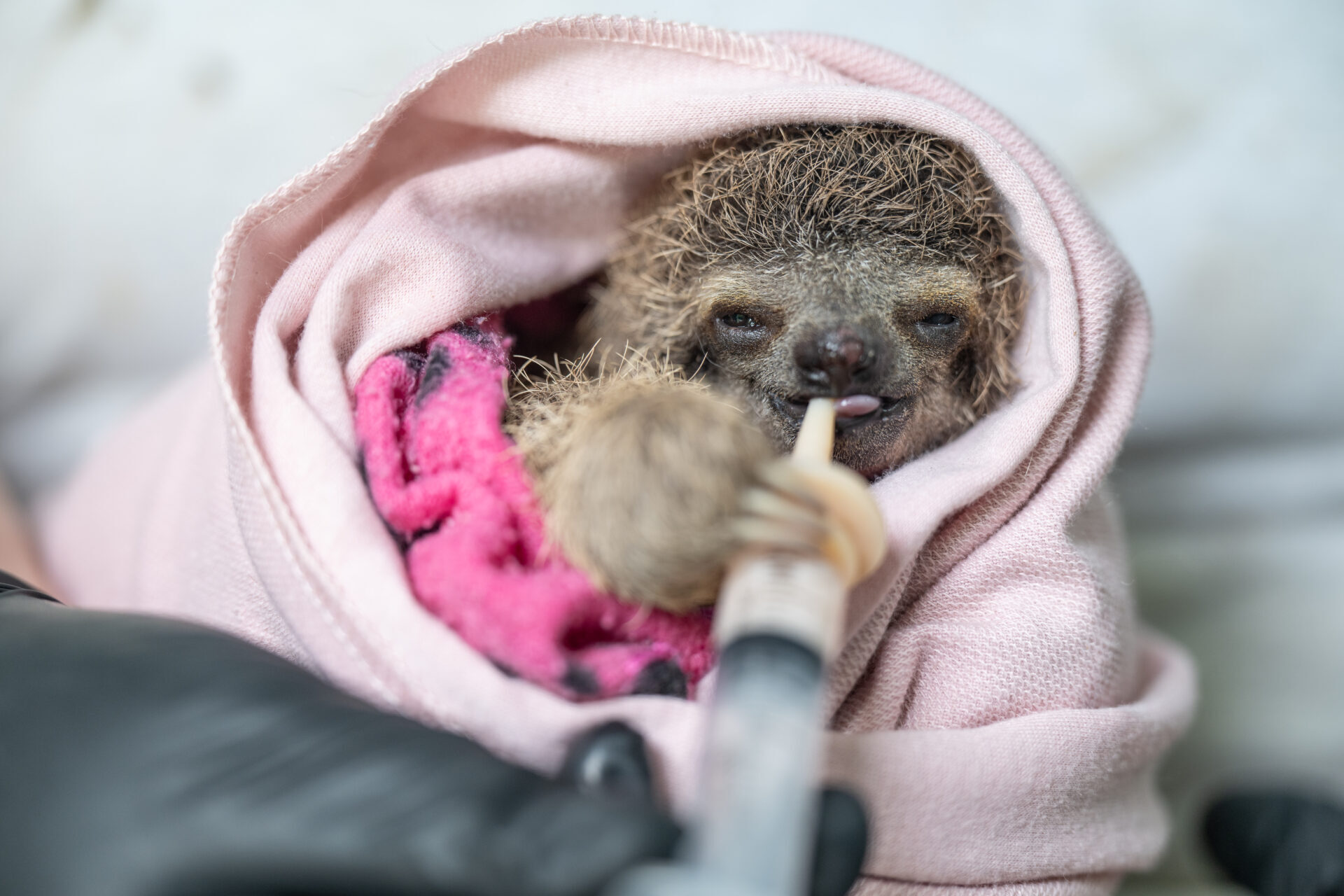 George received a course of antibiotics and nebulization therapy to help his lungs recover and prevent infection. For a baby sloth this young, fragile, dehydrated, and newly orphaned, every hour of care matters.