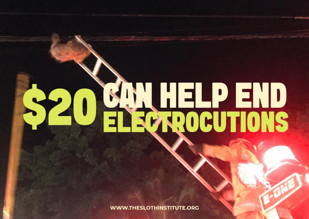 Your donation helps purchase essential safety equipment for firefighters and electric companies, and supports TSI-led educational workshops that teach communities how to prevent electrocutions before they happen. Together, we can save sloths and other arboreal wildlife, one powerline at a time.